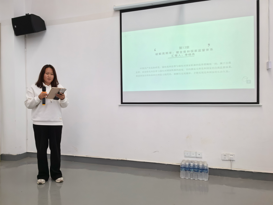 22级专硕班刘艳同志向大家解读了书中提到的把党的政治建设纳入党的建设的总体布局,并突出其根本性的作用和统领地位。在政治建设的统领之下,坚决做到在横向上,牢记初心使命、坚持自我革命;在纵向上,持续正风肃纪反腐,坚持受贿行贿一起查,“打虎”“打蝇”“猎狐”多管齐下。纪律不仅是对党员个人的要求,更是对整个党组织的要求。书中提到,党要不断进行自我革新,清除自身存在的各种问题,保持党的先进性和纯洁性。这种自我革新的能力是党能够长期执政的重要原因之一,也是党不断适应新形势、解决新问题的关键。我们可以将这种自我革命的意识运用到学习中去,不断反思才会不断进步。